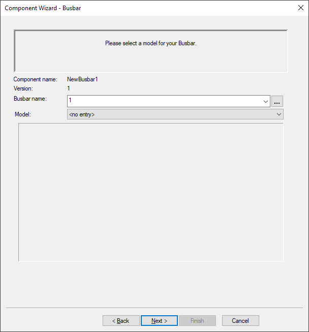 The third step (when creating a Busbar) is to define the name and model for the busbar to be transferred to the database in the Busbar dialog.