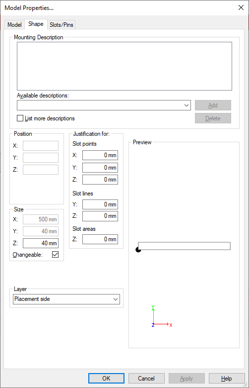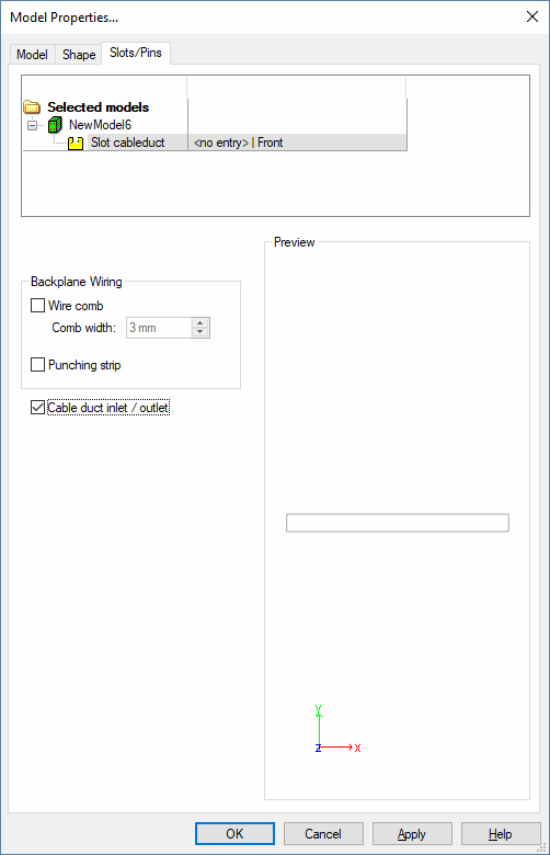 The Model Properties - Slots/Pins tab offers the possibility to define the slot's cable duct properties.
