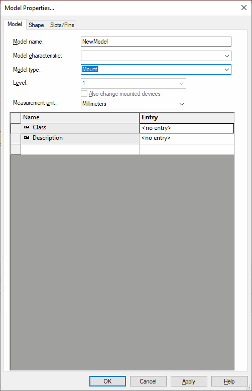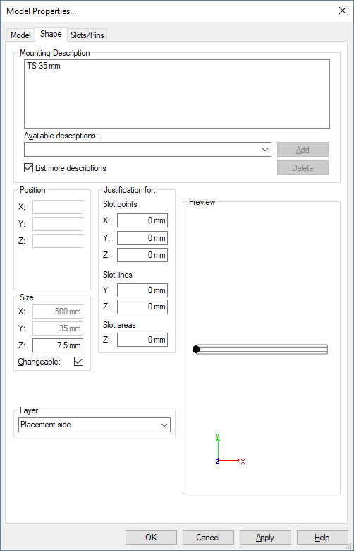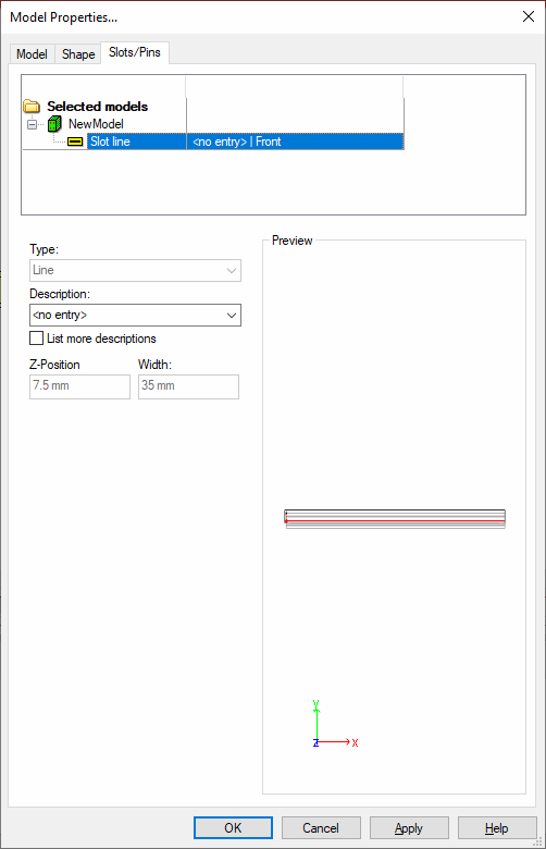 The Model Properties - Slots/Pins tab offers the possibility to define the mounting rail's slot line.