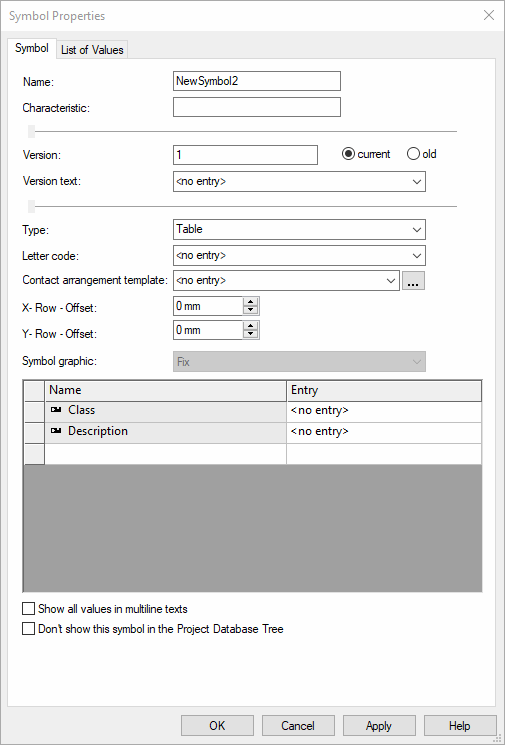 To define the symbol name, its type, description and offset right-click in the working area and select the Symbol Properties... command from the displayed context menu. A table symbol must have the Table type assigned.