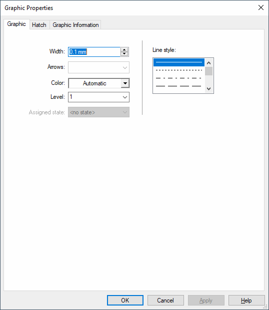 right-click on a graphic object, select Graphic Properties... from the displayed context menu and select the Graphic view. To select more than one object for modification, hold down the 'shift' key, then left-click on each of the desired objects and right-click on the final object to display the context menu.