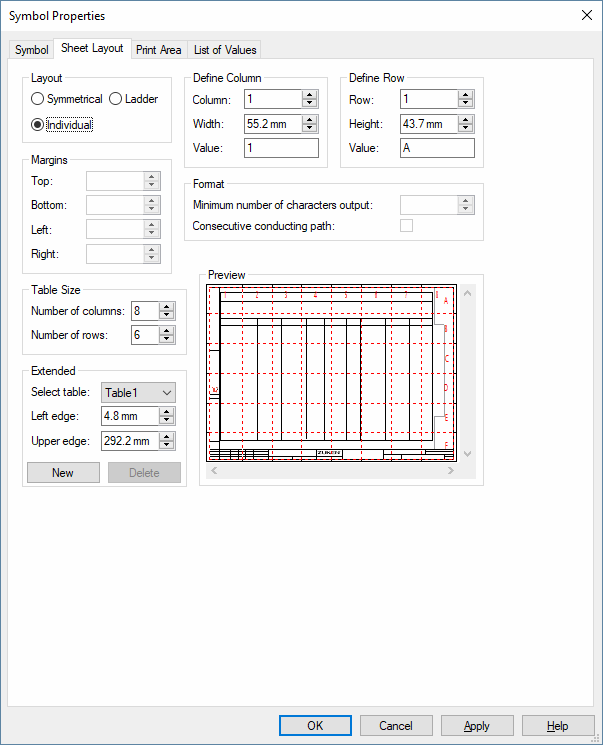 Defines the number of columns and rows. If 'Individual Layout' has been selected, the numbers refer to the current table. |