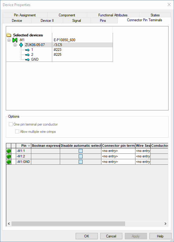 Device Properties - Connector Pin Terminals |