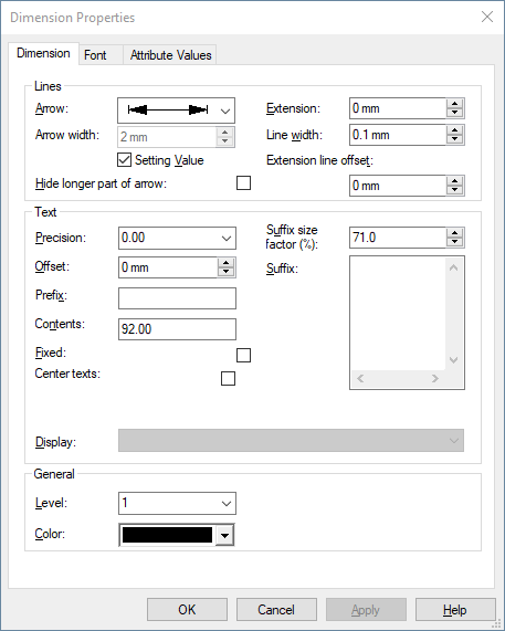 Depending on whether or not the option Fixed has been activated, the calculated dimension text or fixed text will be displayed.