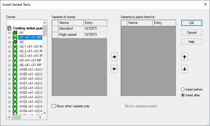 The variant table on the left lists all variants that exist or only the variants different to the default (see 'Show other variants only'). The right arrow button allows you to copy the selected variant(s) to the list on the right.