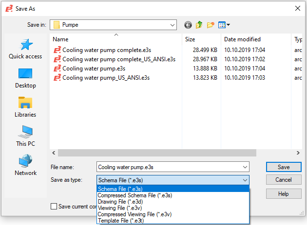 To unpack the compressed file, select the desired File type (e.g. 'Schema File (*.e3s)'in the Save as dialog.