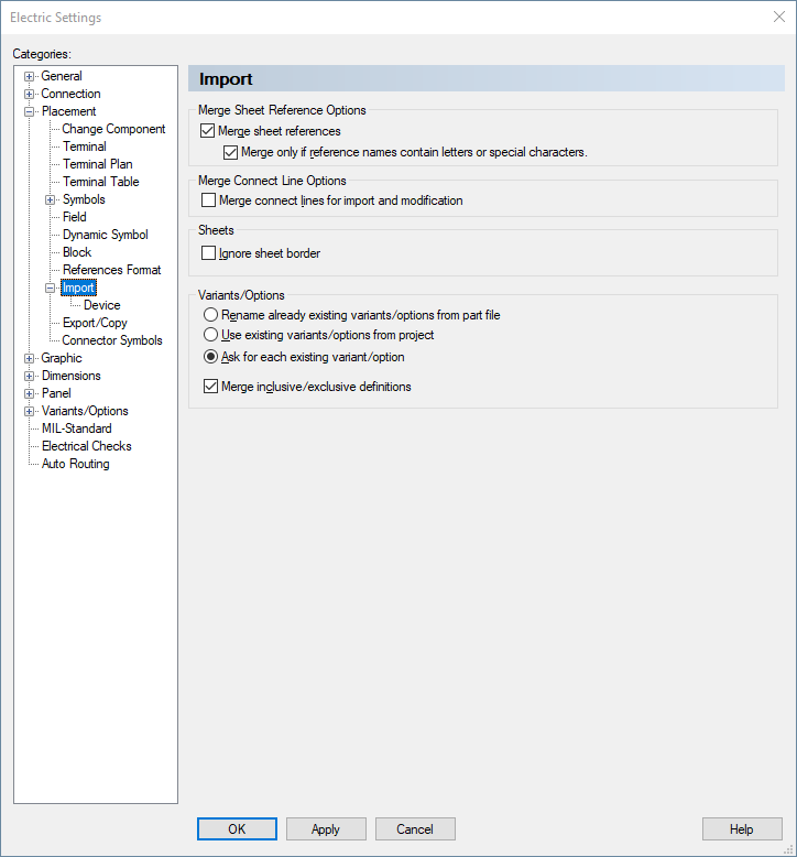 Variants/OptionsThis section is used to define how to handle already existing variants/options in the project and the subcircuit. |