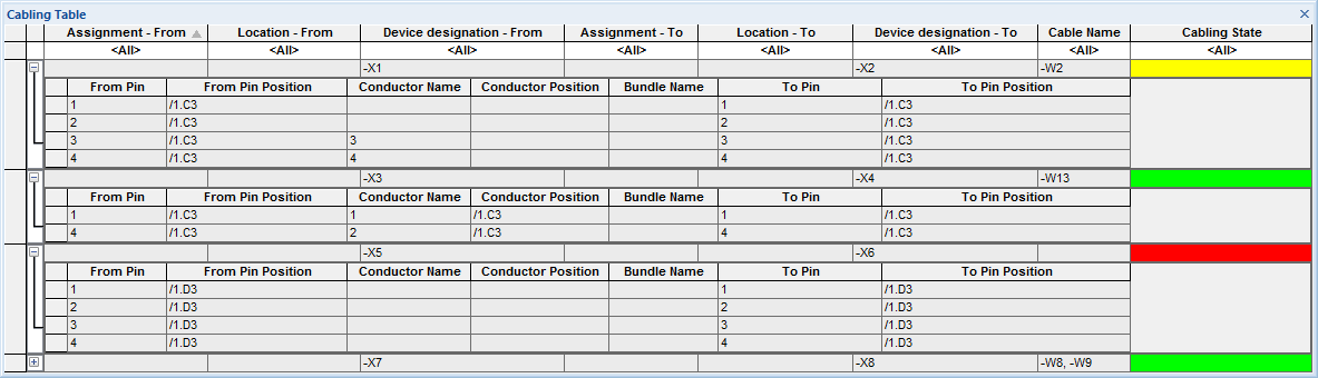 In project mode in E3.series there is a Cabling Table, in which all connected graphical connections are listed with their devices in the project. The individual conductors of a cable are listed. Wires, hoses, tubes and jumpers are not displayed in the Cabling Table. With the help of this Cabling Table cables can be placed more effectively on connections.