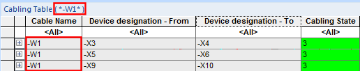 Connections with conductors are permanently displayed in the Cabling Table. As soon as all the conductors are disconnected on the connection, the connection line or the thereupon connected device is suppressed in the Cabling Table.