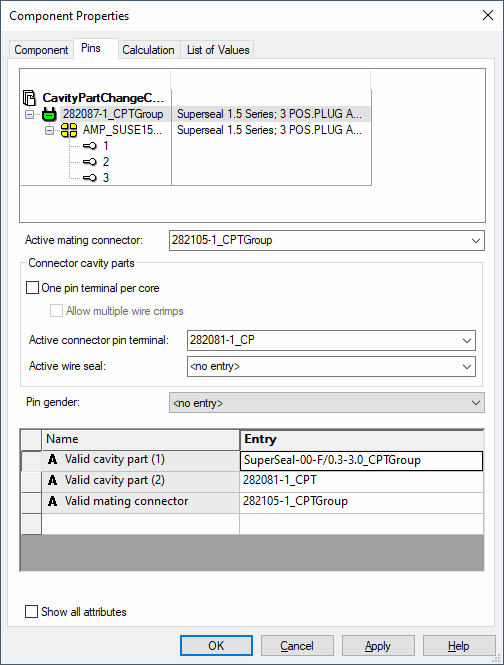 Which connector pin terminals/cavity plugs/wire seals are valid for the component must now be defined in the Database Editor (in this example the connector: 282087-1_CPTGroup).