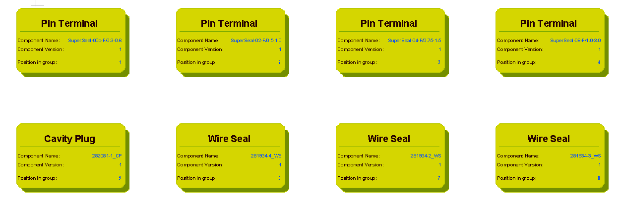 Individual connector pin terminals, cavity plugs and wire seals can be added to a cavity part group and defined later as the valid cavity part on the component.