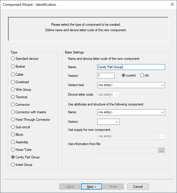 The Component Wizard is started. Select Cavity Part Group as Type in the Identification page and define other properties such as name or attributes.