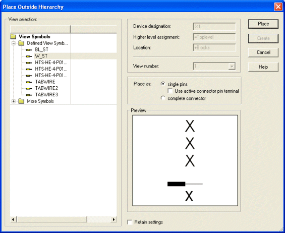 With both commands the Place Outside Hierarchy or Place Inside Hierarchy dialog is displayed, in which the type of placement (either single pin or complete connector) and the desired connector symbol can be selected.