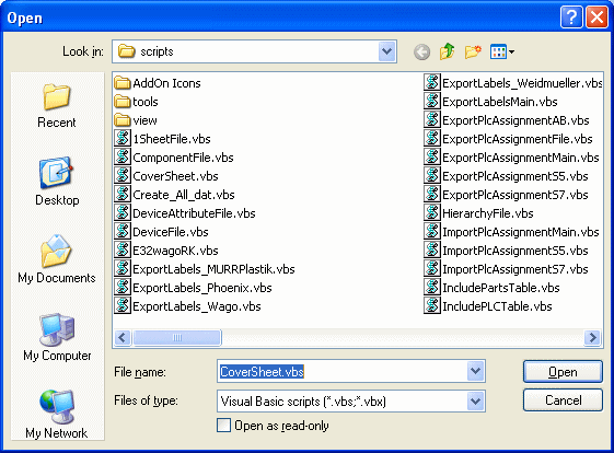 The predefined file type is 'Visual Basic scripts' (*.vbs; *.vbx). |