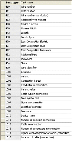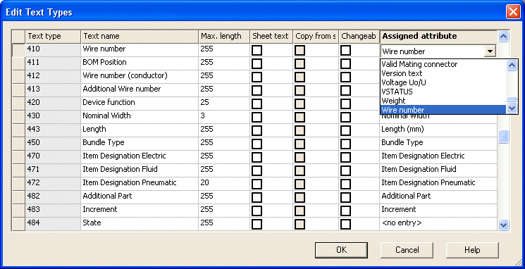 Text type 410 called 'Wire number' bears a relation to the attribute 'Wire number', which is assigned a 'net' or a 'net segment'.