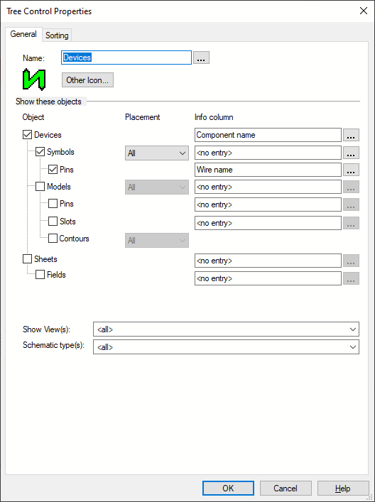 The General tab of the Tree Control Properties dialog allows the user to define, which objects shall be displayed in the tree and which information shall be output in the Info Column.