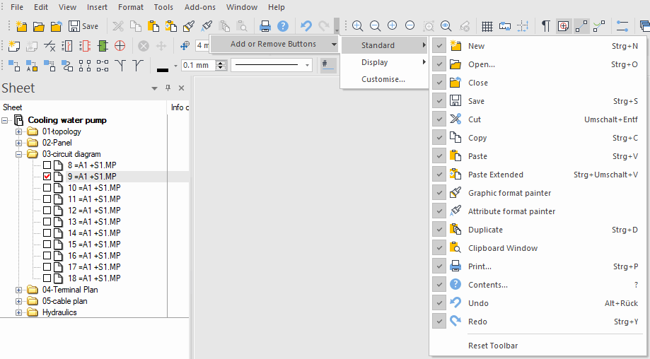 By activating or deactivating the checbox the toolbars can be displayed or hidden in the project.