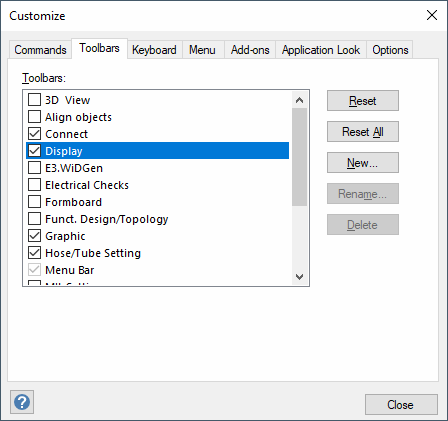 The Reset button resets all modifications (e.g. the arrangement of the buttons) to the selected toolbar and returns the toolbar to its original state.