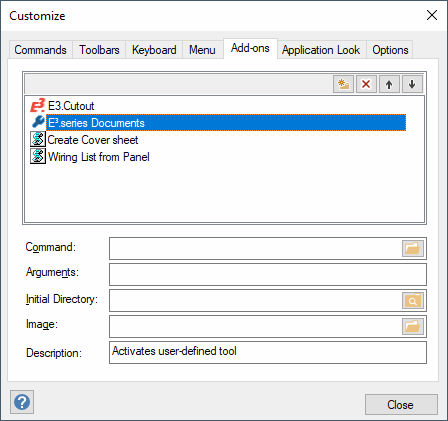 In this dialog new commands (i.e. add-ons) can be defined. To be able to place the commands in the menu or the toolbar, first switch to the Commands tab and activate the Add-ons category. The Add-ons category in the Keyboard tab also contains a list of add-ons, that are sorted alphabetically there. When modifying the command's name in this list, it's automatically modified in the menus and toolbars.