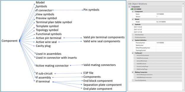 The type of component changes the information displayed in the DB relations window. For instance, a connector may show detailed information such as mating connectors and pin terminals. In contrast, an assembly will show higher-level information about the components in the assembly rather than details about the pins. Significantly, this functionality ties nicely into existing search options to identify parts based on the models, symbols, and features used in their construction.