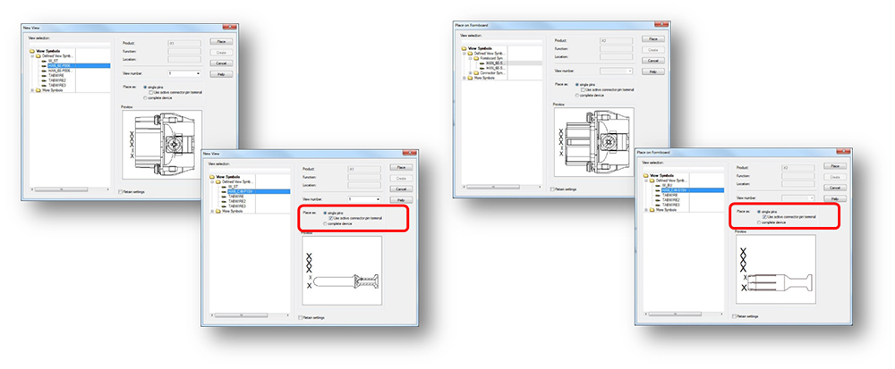 Other enhancements include automatic pin terminal functionality in E3.cable and E3.formboard. Connector pin terminal symbols represented in a cable or formboard drawing are switched automatically when exchanging a component or updating in the project.